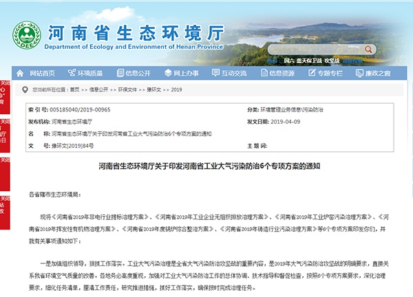 河南省生態(tài)環(huán)境廳關于印發(fā)河南省工業(yè)大氣污染防治6個專項方案的通知