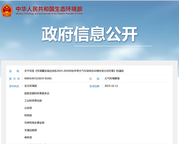 2019年10月11日,生態(tài)環(huán)境部聯(lián)合國(guó)家發(fā)展和改革委員會(huì)、工業(yè)和信息化部、公安部、財(cái)政部、住房和城鄉(xiāng)建設(shè)部等發(fā)布關(guān)于印發(fā)《京津冀及周邊地區(qū)2019-2020年秋冬季大氣污染綜合治理攻堅(jiān)行動(dòng)方案》的通知,詳情如下:
