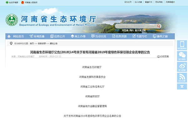 2019年12月13日,河南省生態(tài)環(huán)境廳聯(lián)合河南省發(fā)展和改革委員會、河南省工業(yè)和信息化廳、河南省財政廳、河南省地方金融監(jiān)督管理局、關(guān)于發(fā)布河南省2019年度綠色環(huán)保引領(lǐng)企業(yè)名單的公告發(fā)布河南省生態(tài)環(huán)境廳公告﹝2019﹞14號關(guān)于發(fā)布河南省2019年度綠色環(huán)保引領(lǐng)企業(yè)名單的公告,詳情如下: