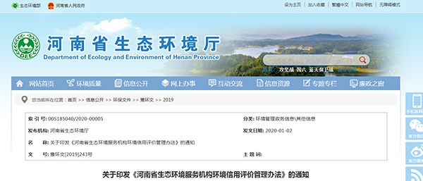 2020年01月02日,河南省生態(tài)環(huán)境廳發(fā)布了關于印發(fā)《河南省生態(tài)環(huán)境服務機構(gòu)環(huán)境信用評價管理辦法》的通知,詳情如下: