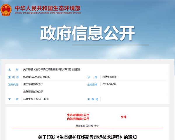 2019年8月30日,生態(tài)環(huán)境部、自然資源部發(fā)布了《生態(tài)保護(hù)紅線勘界定標(biāo)技術(shù)規(guī)程》,詳情如下:
