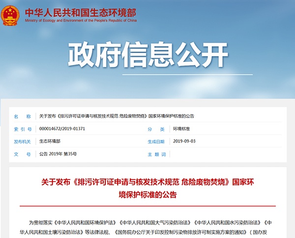 2019年9月3日,生態(tài)環(huán)境部發(fā)布《排污許可證申請與核發(fā)技術(shù)規(guī)范 危險(xiǎn)廢物焚燒》,詳情如下: