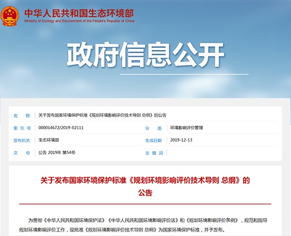 2019年12月13日,生態(tài)環(huán)境部發(fā)布了《規(guī)劃環(huán)境影響評價技術(shù)導(dǎo)則 總綱》(HJ130-2019),詳情如下: