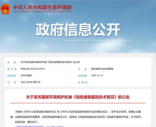 生態(tài)環(huán)境部關(guān)于發(fā)布國家環(huán)境保護(hù)標(biāo)準(zhǔn)《危險廢物鑒別技術(shù)規(guī)范》的公告
