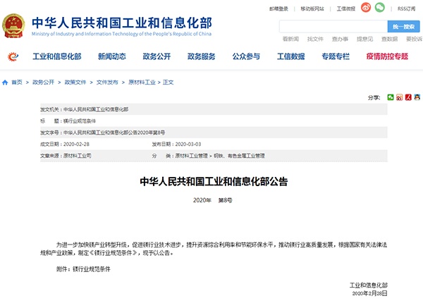 2020年3月3日,工業(yè)和信息化部發(fā)布了《鎂行業(yè)規(guī)范條件》,詳情如下: