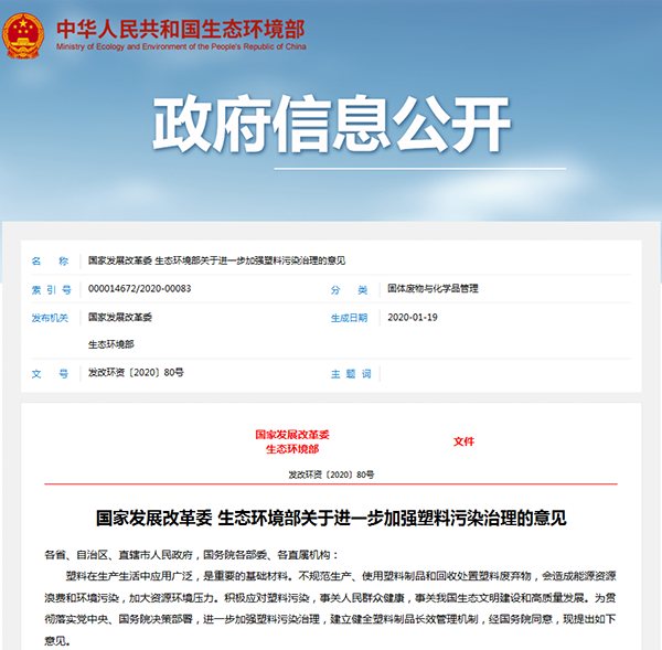 2020年1月19日,國家發(fā)展改革委、生態(tài)環(huán)境部聯(lián)合印發(fā)了《關(guān)于進一步加強塑料污染治理的意見》,詳情如下: