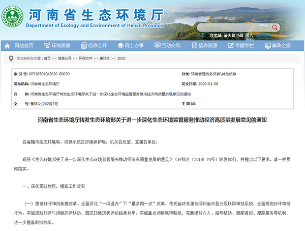 2020年1月8日,河南省生態(tài)環(huán)境廳轉(zhuǎn)發(fā)了生態(tài)環(huán)境部關(guān)于進(jìn)一步深化生態(tài)環(huán)境監(jiān)管服務(wù)推動(dòng)經(jīng)濟(jì)高質(zhì)量發(fā)展意見(jiàn)的通知,詳情如下: