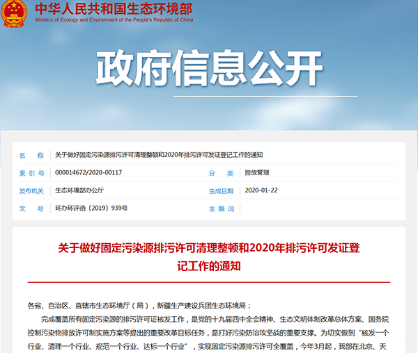 2020年1月22日,生態(tài)環(huán)境部發(fā)布了《關(guān)于做好固定污染源排污許可清理整頓和2020年排污許可發(fā)證登記工作的通知》,詳情如下: