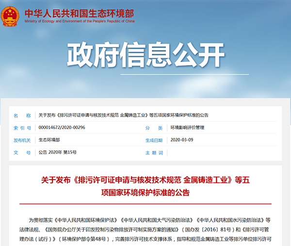 2020年3月9日,生態(tài)環(huán)境部發(fā)布了《排污許可證申請(qǐng)與核發(fā)技術(shù)規(guī)范 金屬鑄造工業(yè)》等五項(xiàng)國(guó)家環(huán)境保護(hù)標(biāo)準(zhǔn),詳情如下: