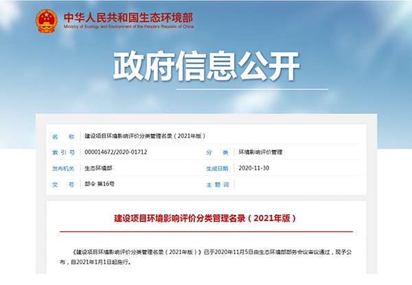 生態(tài)環(huán)境部發(fā)布《建設(shè)項目環(huán)境影響評價分類管理名錄(2021年版)》的公告