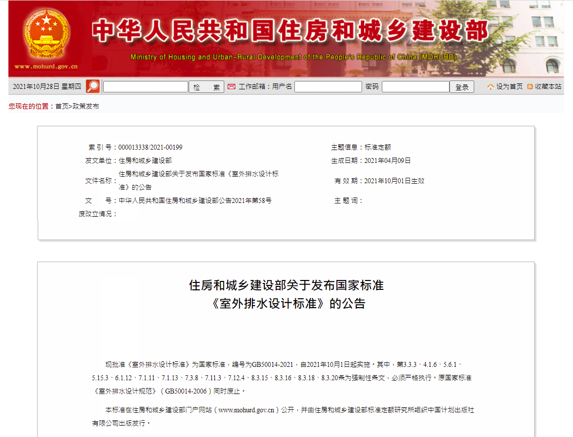 現(xiàn)批準(zhǔn)《室外排水設(shè)計標(biāo)準(zhǔn)》為國家標(biāo)準(zhǔn),編號為GB50014-2021,自2021年10月1日起實施。其中,第3.3.3、4.1.6、5.6.1、5.15.3、6.1.12、7.1.11、7.1.13、7.3.8、7.11.3、7.12.4、8.3.15、8.3.16、8.3.18、8.3.20條為強(qiáng)制性條文,必須嚴(yán)格執(zhí)行。原國家標(biāo)準(zhǔn)《室外排水設(shè)計規(guī)范》(GB50014-2006)同時廢止。