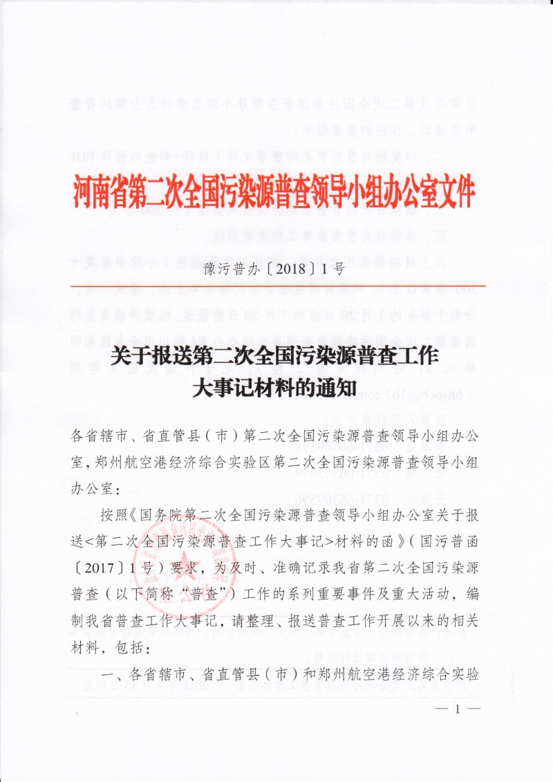 豫污普辦【2018】1號關(guān)于報(bào)送《第二次全國污染源普查工作大事記》材料的通知