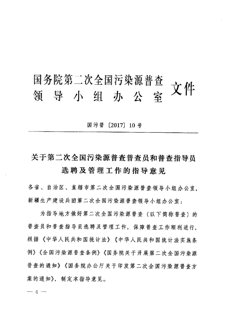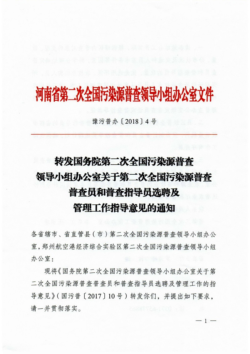 豫污普辦【2018】4號(hào)轉(zhuǎn)發(fā)國務(wù)院第二次全國污染源普查領(lǐng)導(dǎo)小組辦公室關(guān)于第二次全國污染源普查普查員和普查指導(dǎo)員選聘及管理工作指導(dǎo)意見的通知